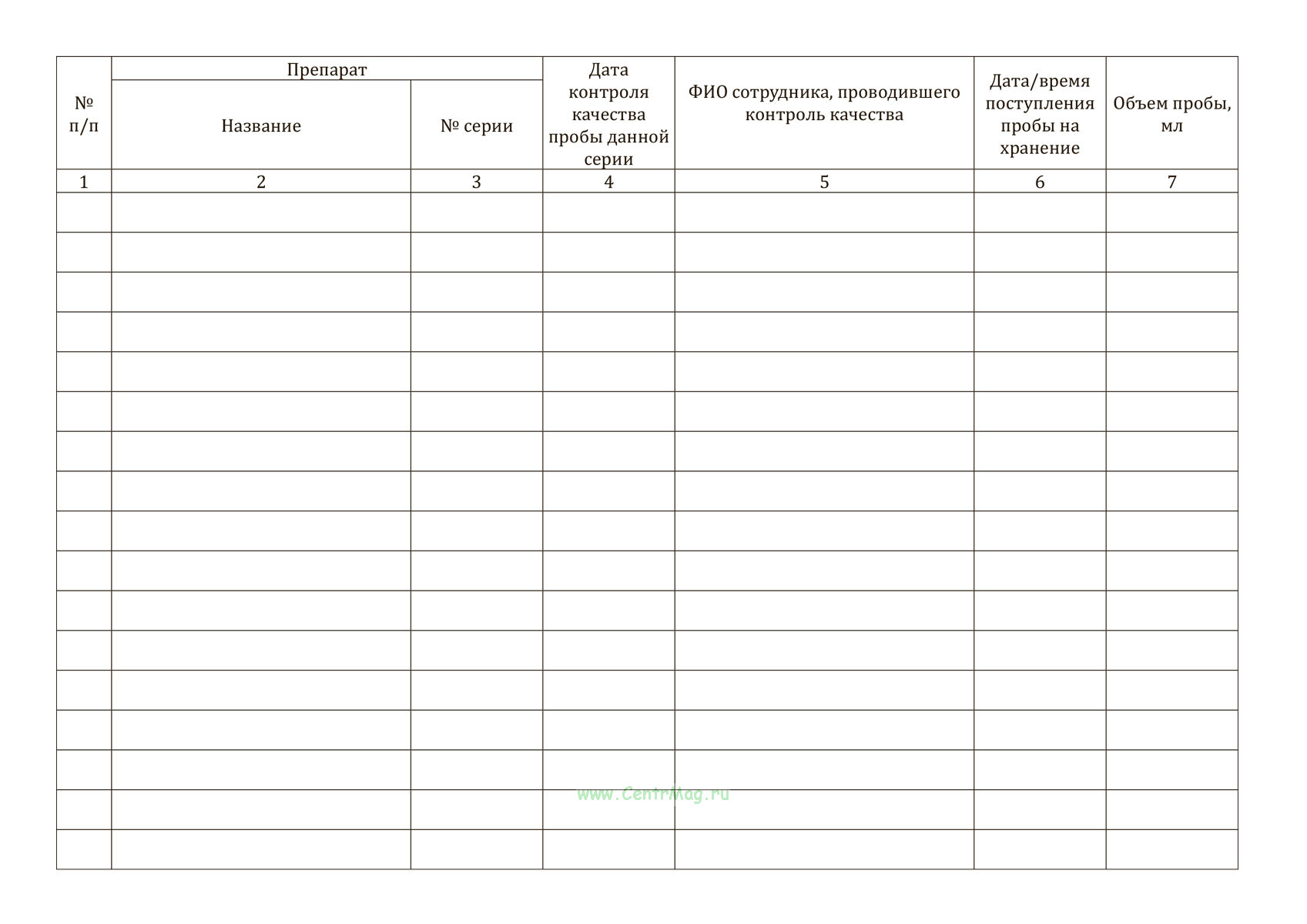 Журнал используется для регистрации данных о пробах, взятых для контроля качества, в том числе информации о сериях препаратов, объеме и времени их поступления на хранение. Он помогает отслеживать результаты контроля качества и соблюдение стандартов при проверке продукции.