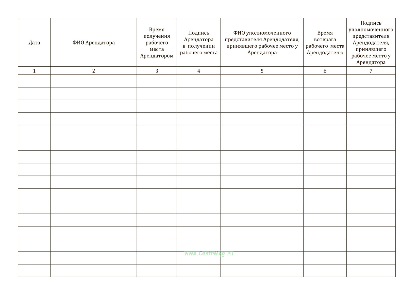 Журнал применяется для фиксации фактов передачи и возврата арендованных рабочих мест, а также для учета времени их использования и ответственности сторон при эксплуатации.