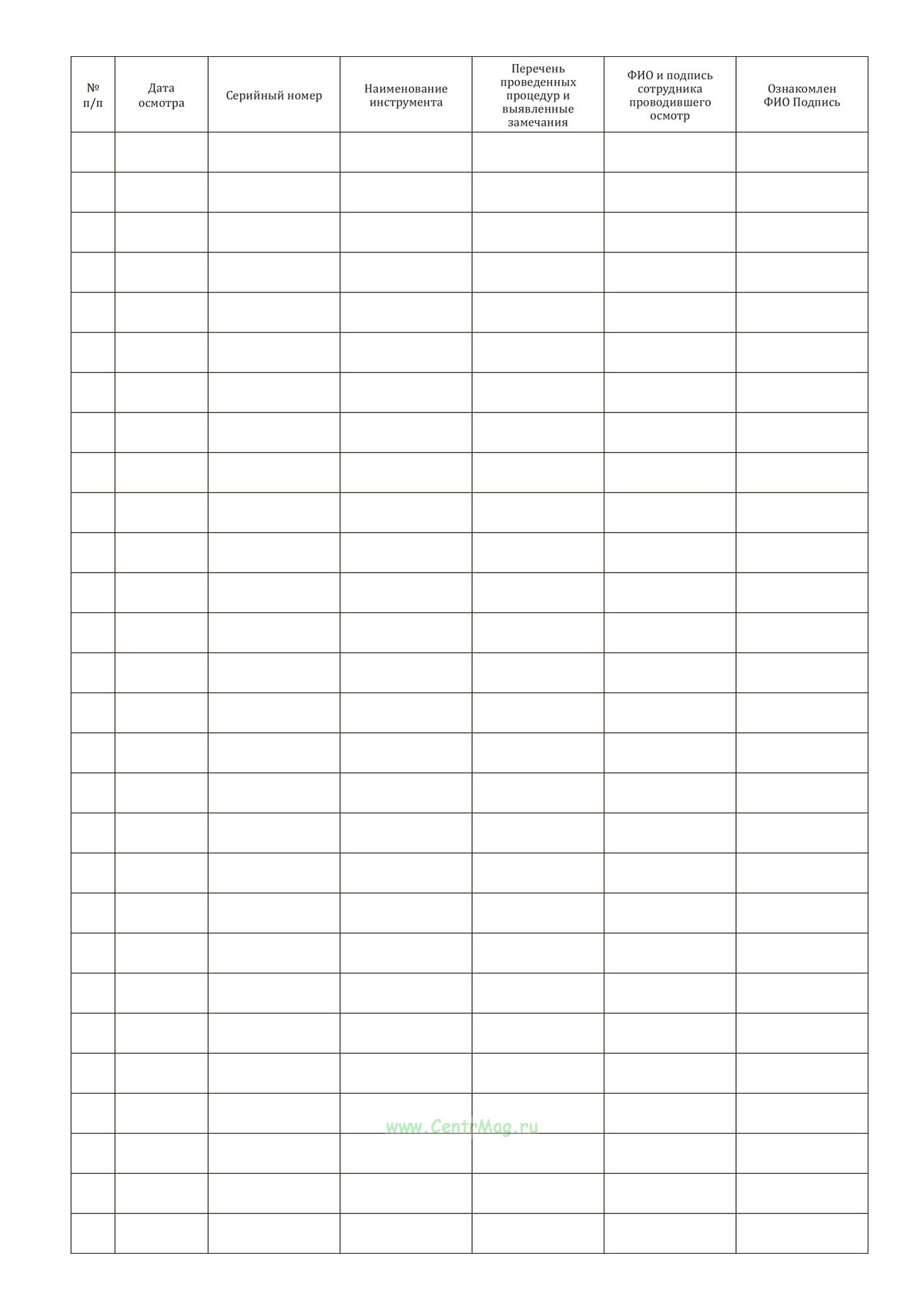 Журнал применяется для регистрации приемки и выдачи инструментов и оборудования, контроля их состояния, а также для учета проведенных осмотров, выявленных замечаний и необходимых процедур.