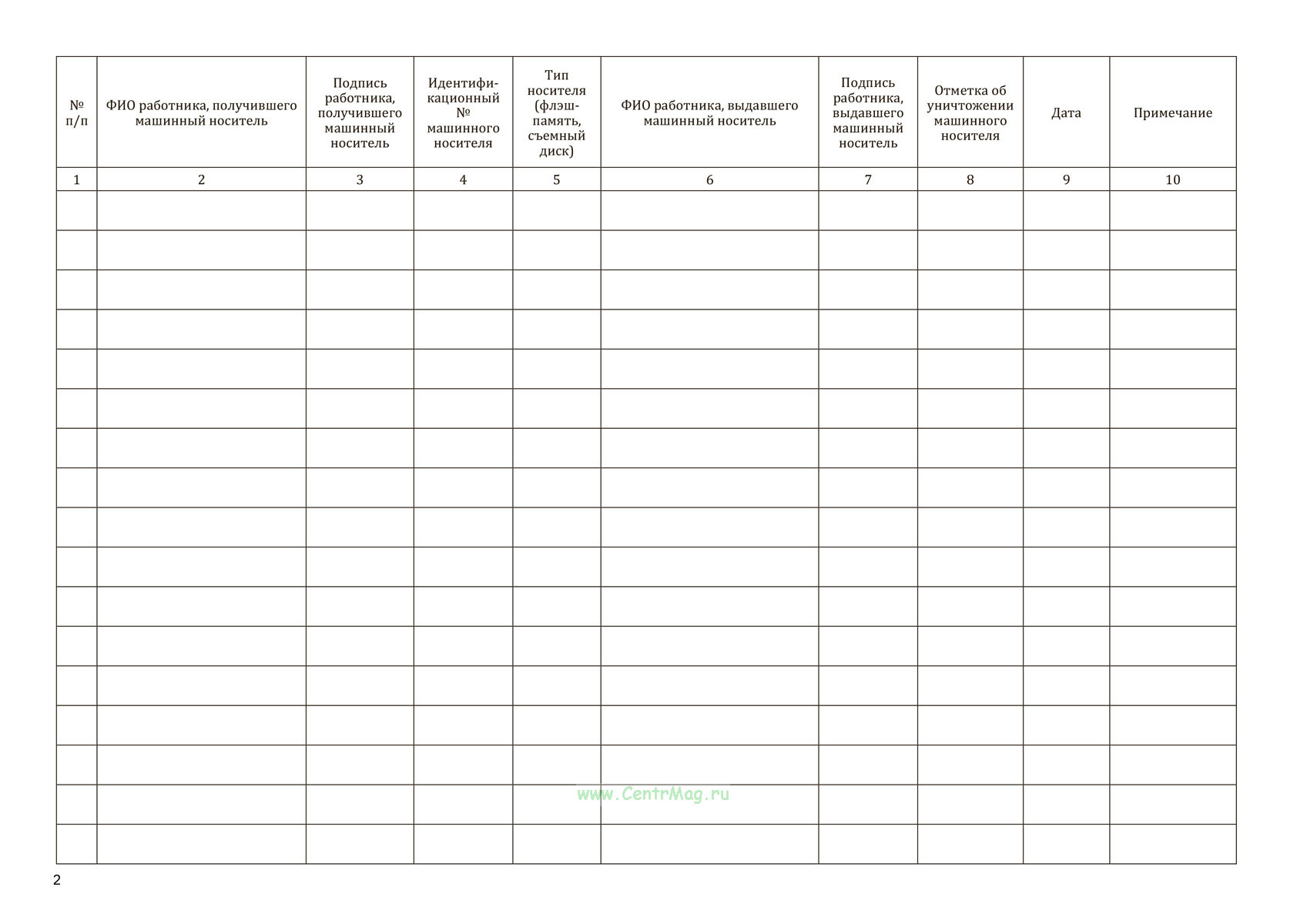 Журнал используется для регистрации выдачи, получения и уничтожения носителей (флэш-память, диски и др.), содержащих персональные данные работников. Он обеспечивает контроль их использования и соблюдение требований законодательства о защите информации.
