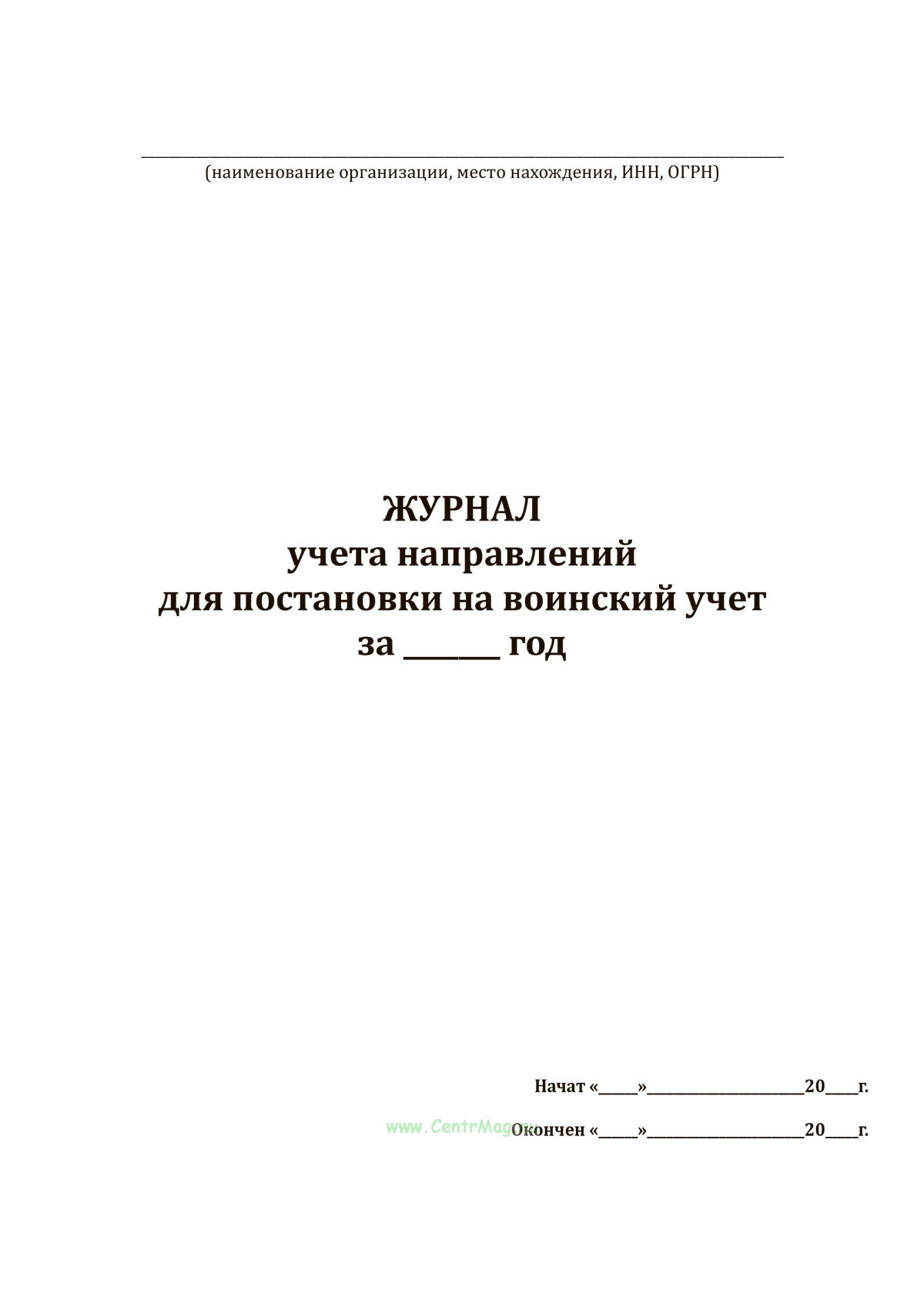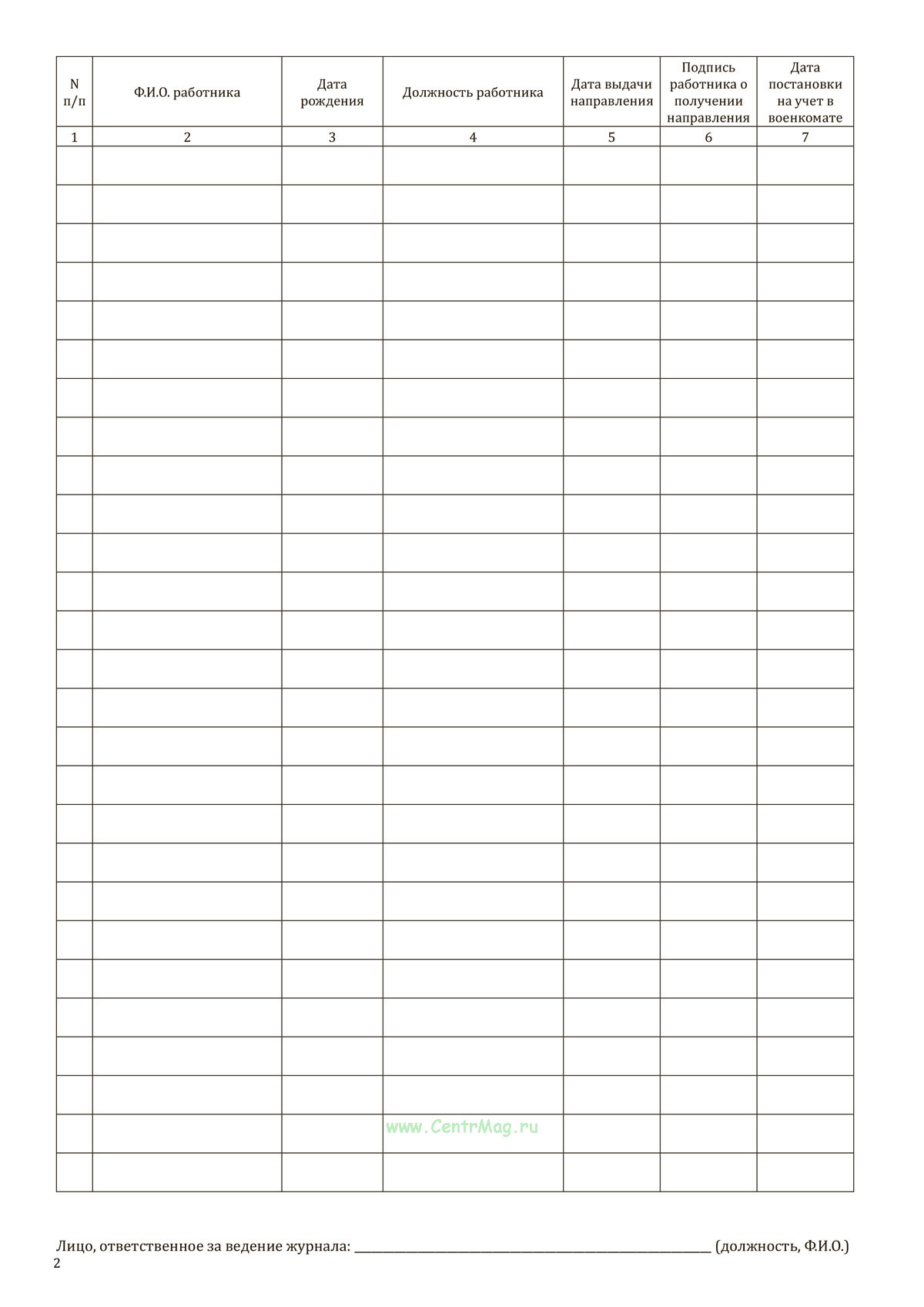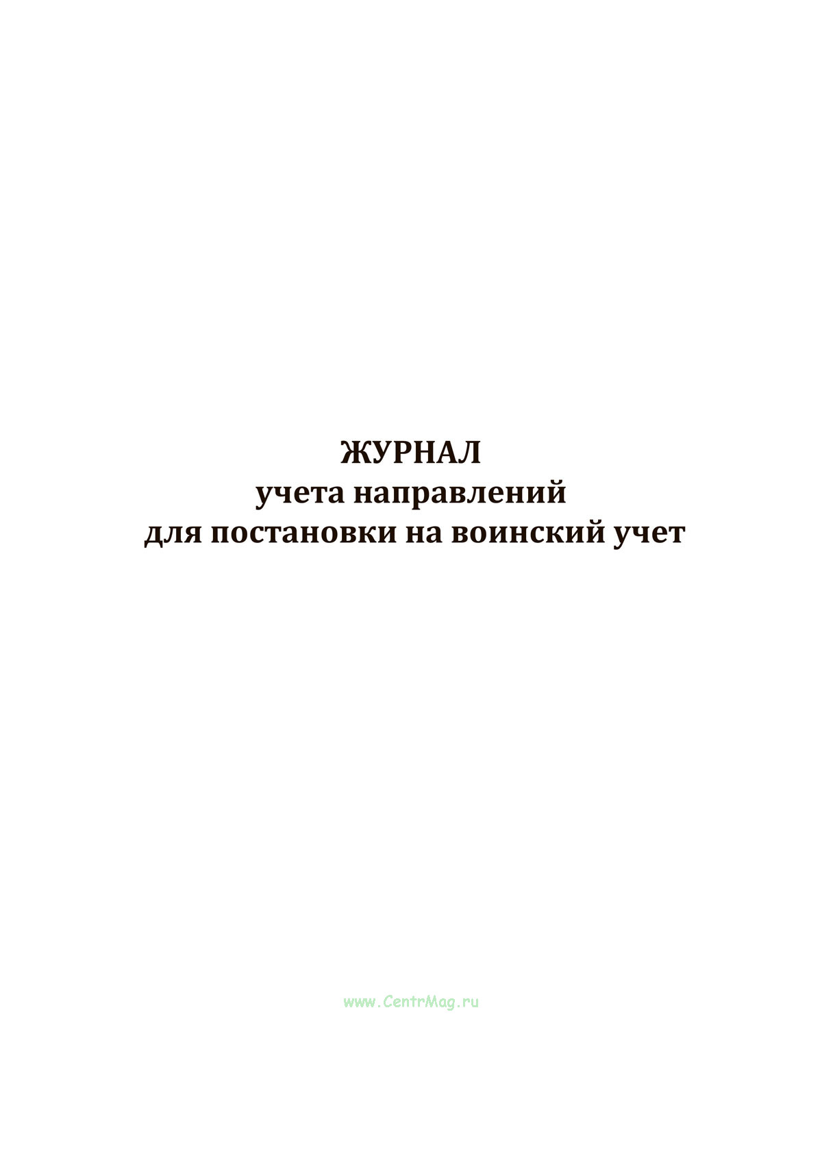 Журнал предназначен для регистрации выдачи направлений в военкомат и контроля постановки сотрудников на воинский учёт. Используется организациями для документального подтверждения соблюдения установленных требований.
