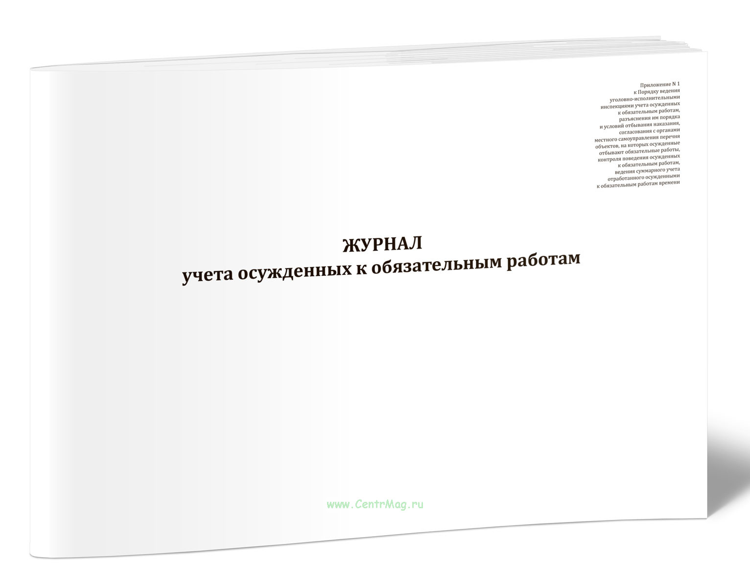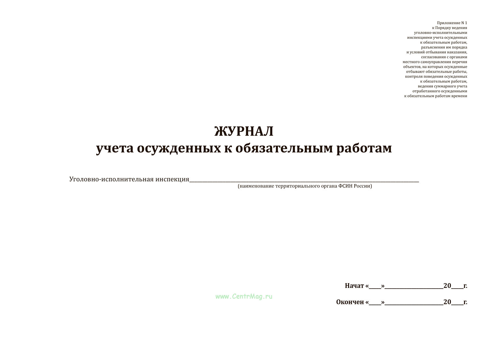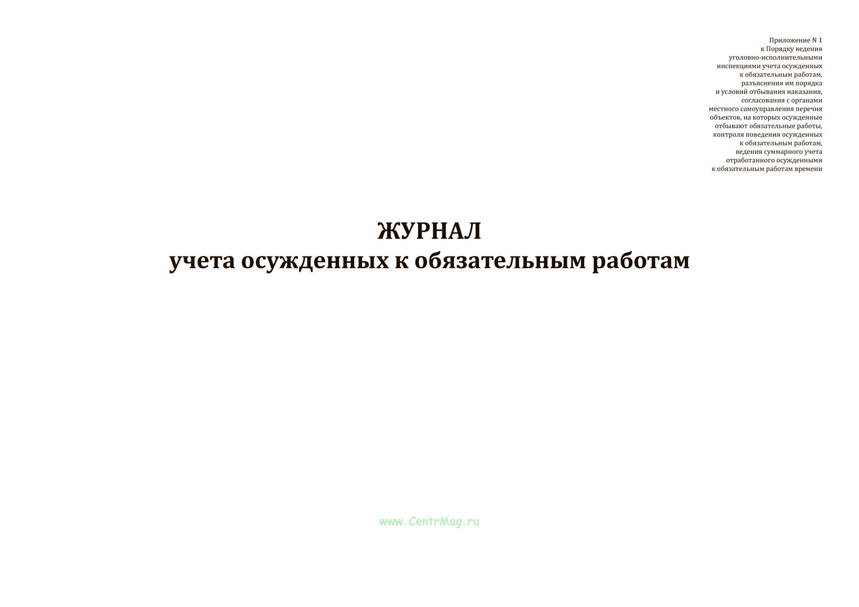 Форма Журнала учета осужденных к обязательным работам соответствует Приложению N 1 к Приказу Минюста России от 19.01.2026 N 6 "Об организации исполнения наказаний в виде обязательных работ, лишения права занимать определенные должности или заниматься определенной деятельностью, исправительных работ, контроля за поведением осужденных, к которым применена отсрочка отбывания наказания, условно осужденных" (вместе с "Порядком ведения уголовно-исполнительными инспекциями учета осужденных к обязательным работам, разъяснения им порядка и условий отбывания наказания, согласования с органами местного самоуправления перечня объектов, на которых осужденные отбывают обязательные работы, контроля поведения осужденных к обязательным работам, ведения суммарного учета отработанного осужденными к обязательным работам времени", "Порядком ведения уголовно-исполнительными инспекциями учета осужденных к наказанию в виде лишения права занимать определенные должности или заниматься определенной деятельностью, контроля соблюдения осужденными предусмотренного приговором суда запрета занимать определенные должности или заниматься определенной деятельностью, проверки исполнения требований приговора администрацией организаций, в которых работают осужденные, а также органами, правомочными аннулировать разрешение на занятие определенной деятельностью, запрещенной осужденным, организации проведения с осужденными к наказанию в виде лишения права занимать определенные должности или заниматься определенной деятельностью воспитательной работы", "Порядком ведения уголовно-исполнительными инспекциями учета осужденных к исправительным работам, разъяснения порядка и условий отбывания наказания, контроля соблюдения условий отбывания наказания осужденными к исправительным работам и исполнения требований приговора администрацией организаций, в которых они работают, проведения с осужденными к исправительным работам воспитательной работы, осуществления контроля поведения осужденных к исправительным работам с участием сотрудников полиции, направления осужденных к исправительным работам в органы службы занятости для трудоустройства, принятия решения о приводе осужденных к исправительным работам, не являющихся по вызову или на регистрацию без уважительных причин, проведения первоначальных мероприятий по розыску осужденных к исправительным работам, подготовки и передачи материалов об осужденных к исправительным работам, местонахождение которых неизвестно", "Порядком осуществления уголовно-исполнительными инспекциями постановки на учет осужденных, к которым применена отсрочка отбывания наказания в соответствии с частью первой статьи 82 Уголовного кодекса Российской Федерации, контроля за их поведением", "Порядком осуществления уголовно-исполнительными инспекциями контроля за поведением условно осужденных в течение испытательного срока")