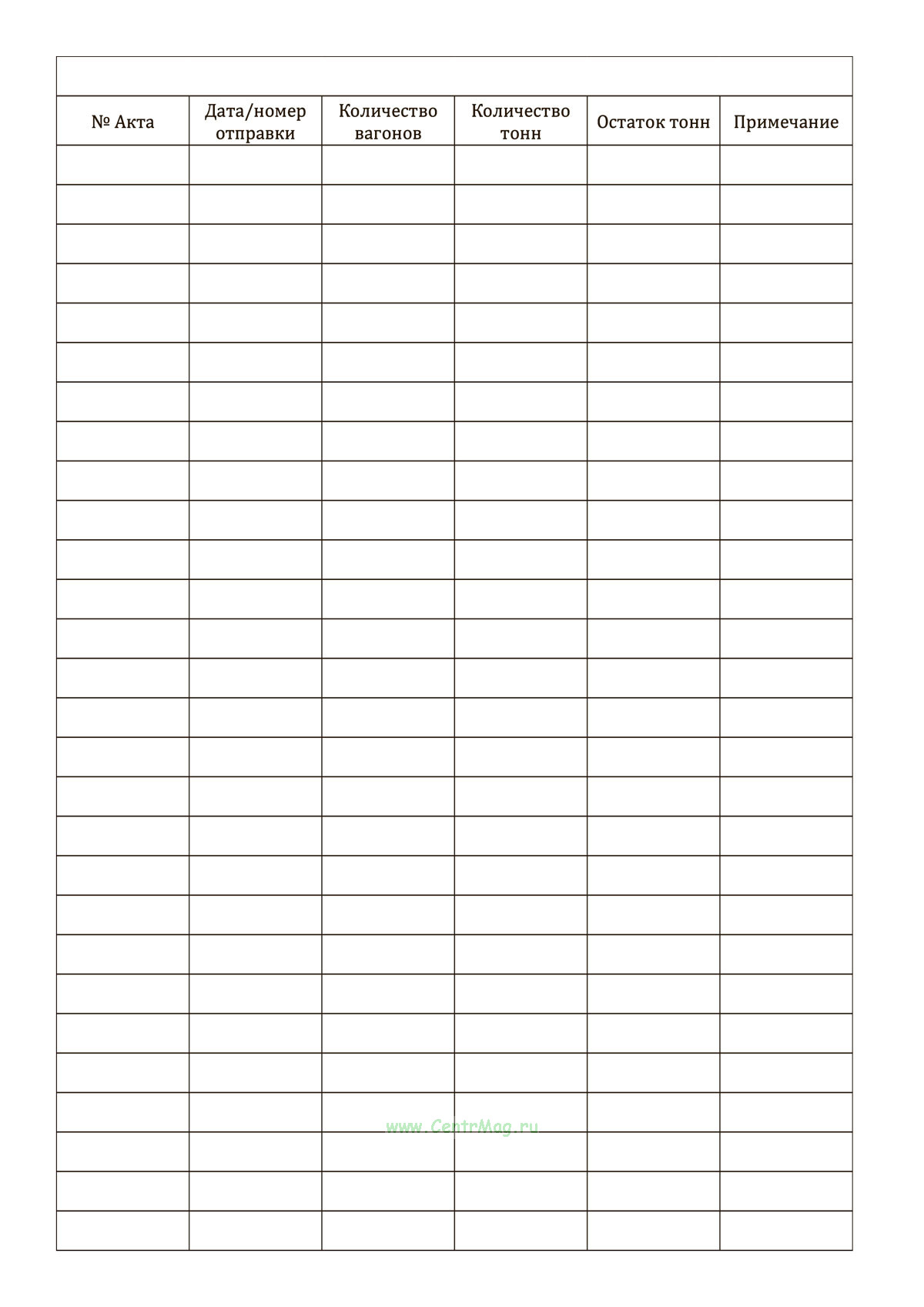 Журнал применяется для регистрации всех отгрузок, осуществляемых с использованием железнодорожных вагонов, включая информацию о номере акта, количестве вагонов и тонн, а также отслеживания остатков и примечаний по отгрузкам.