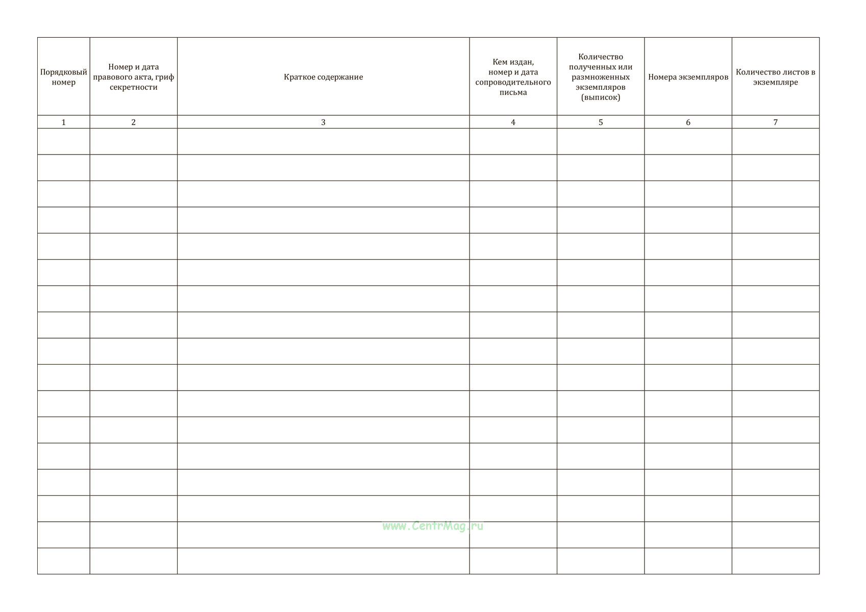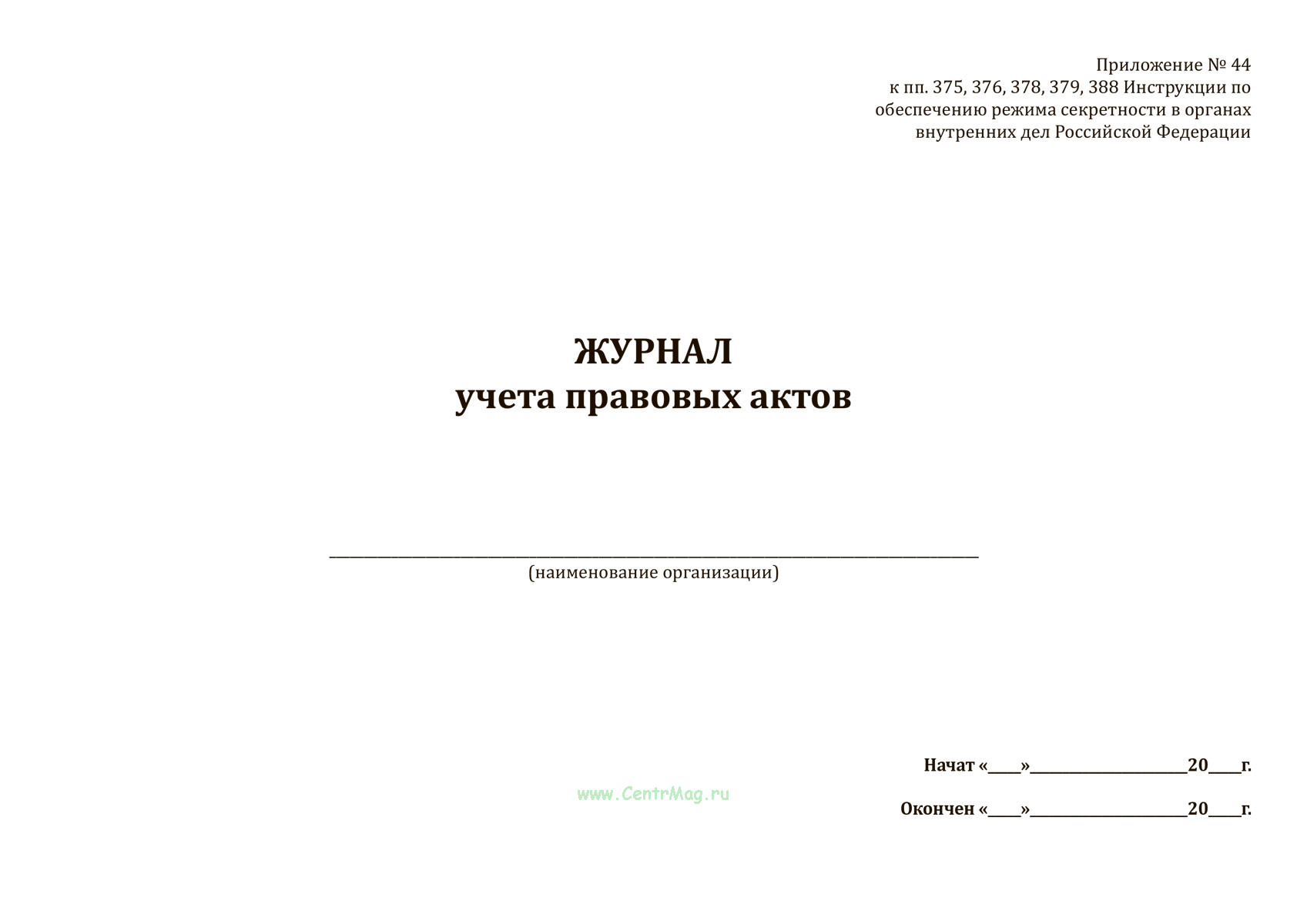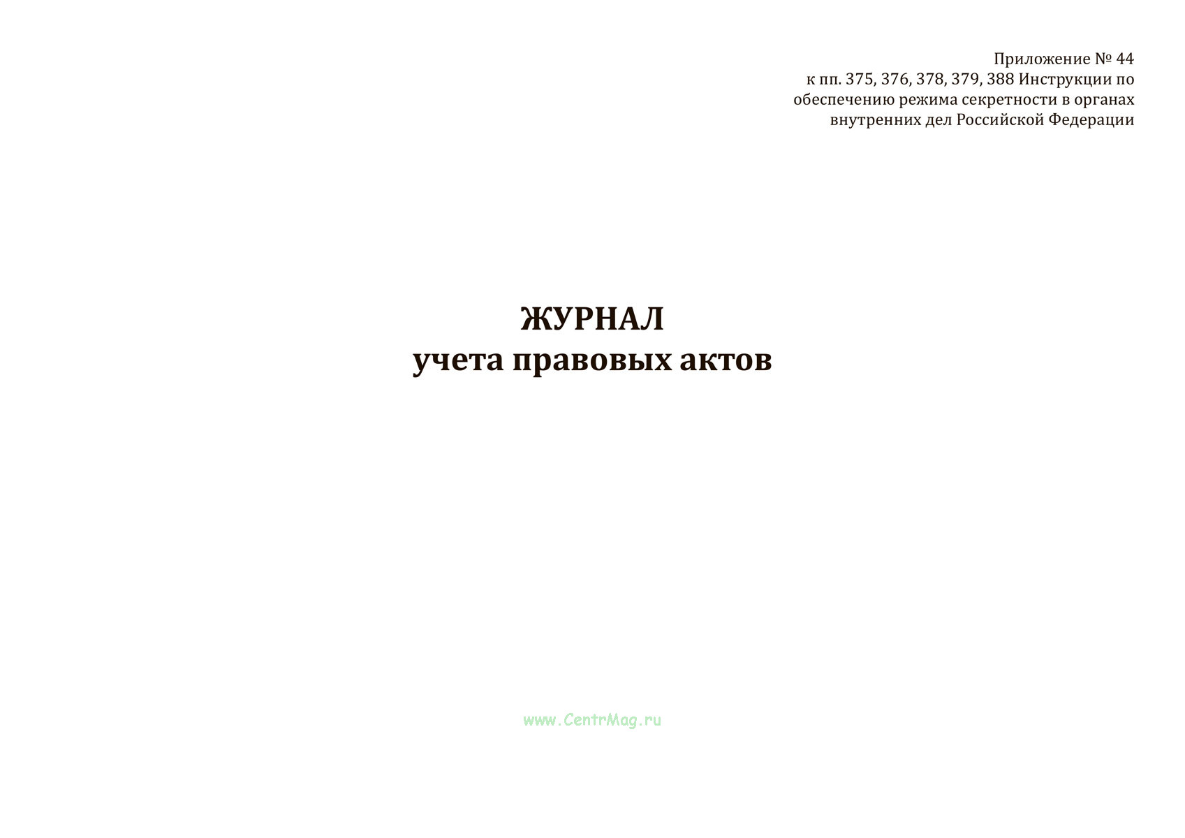 Форма журнала соответствует Приложению № 44 к пп. 375, 376, 378, 379, 388 Инструкции по обеспечению режима секретности в органах внутренних дел Российской Федерации и применяется для регистрации и систематизации правовых документов организации, а также для обеспечения их учета, контроля движения, хранения и использования в служебной деятельности.