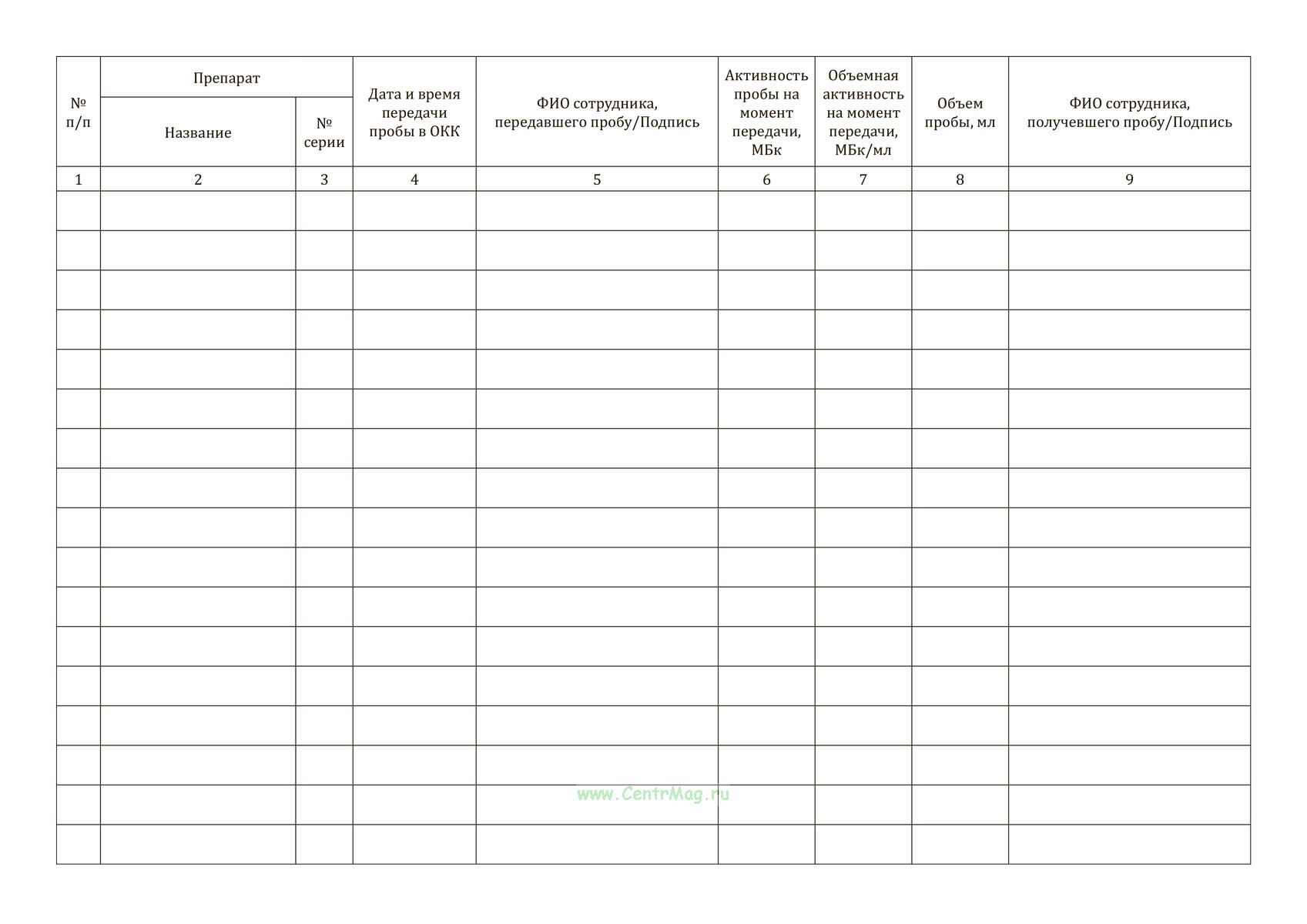 Журнал применяется для регистрации передачи проб препаратов в отдел контроля качества, фиксации времени передачи, их характеристик и подтверждения приема ответственным сотрудником.