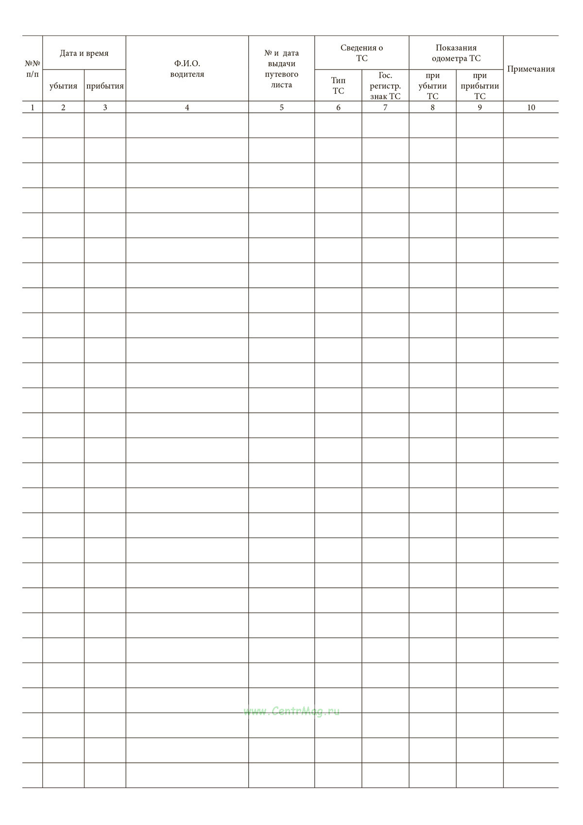 Журнал применяется для регистрации выезда и возвращения транспортных средств, учета показаний одометра, контроля работы водителей и движения служебного транспорта.