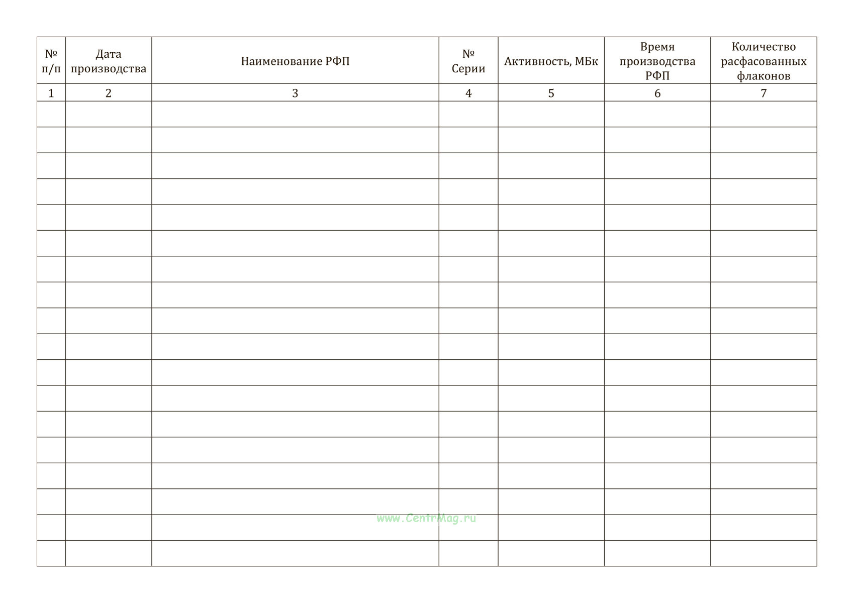 Журнал применяется для регистрации выпуска продукции, фиксации даты и времени производства, серии, активности и количества произведенных единиц, а также контроля учета готовой продукции.