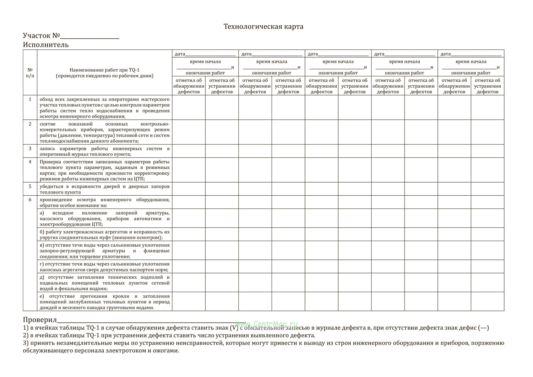 1. обход всех закрепленных за операторами мастерского участка тепловых пунктов с целью контроля параметров работы систем тепло водоснабжения и проведения осмотра инженерного оборудования;