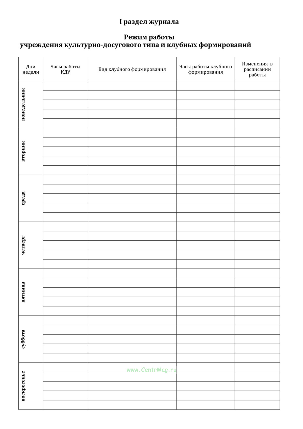 I раздел журнала. Режим работы учреждения культурно-досугового типа и клубных формирований