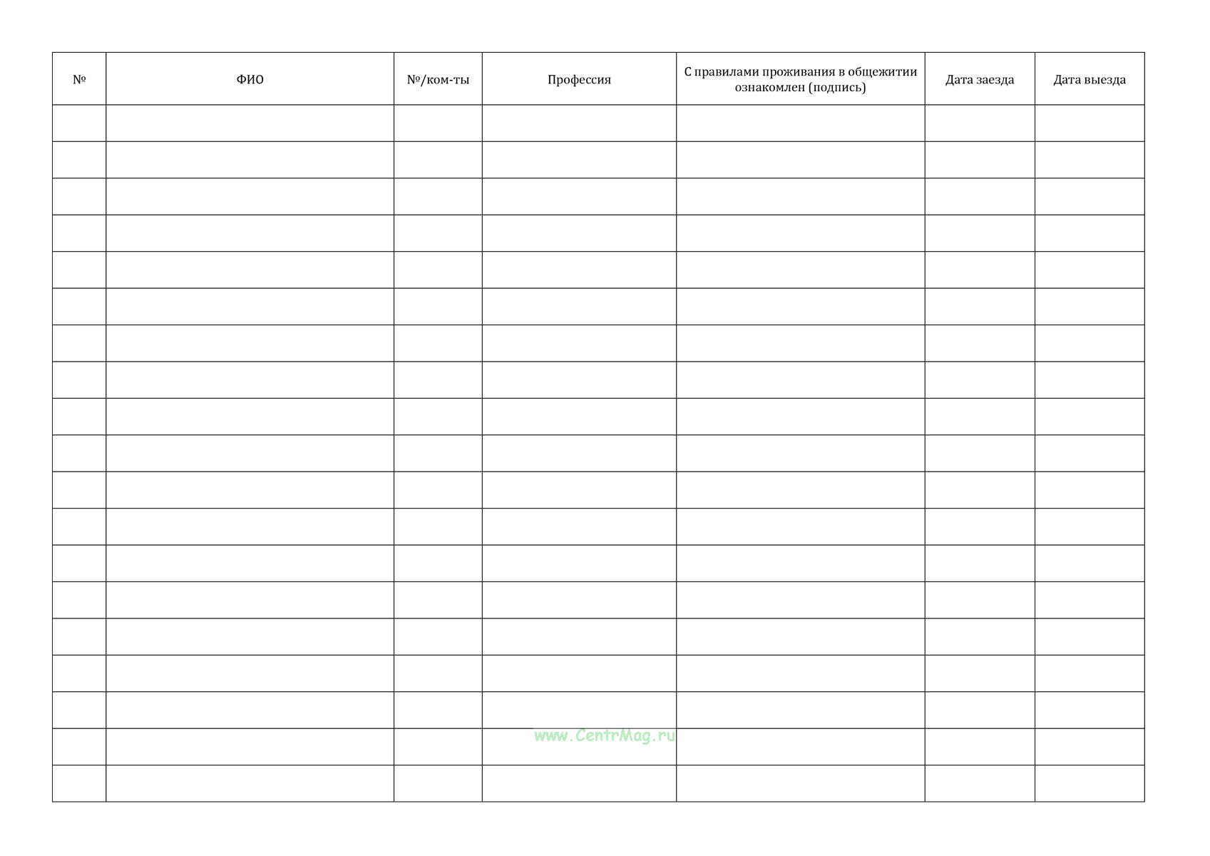 Журнал применяется для учета заселения и выбытия сотрудников, контроля их проживания и подтверждения ознакомления с правилами общежития.