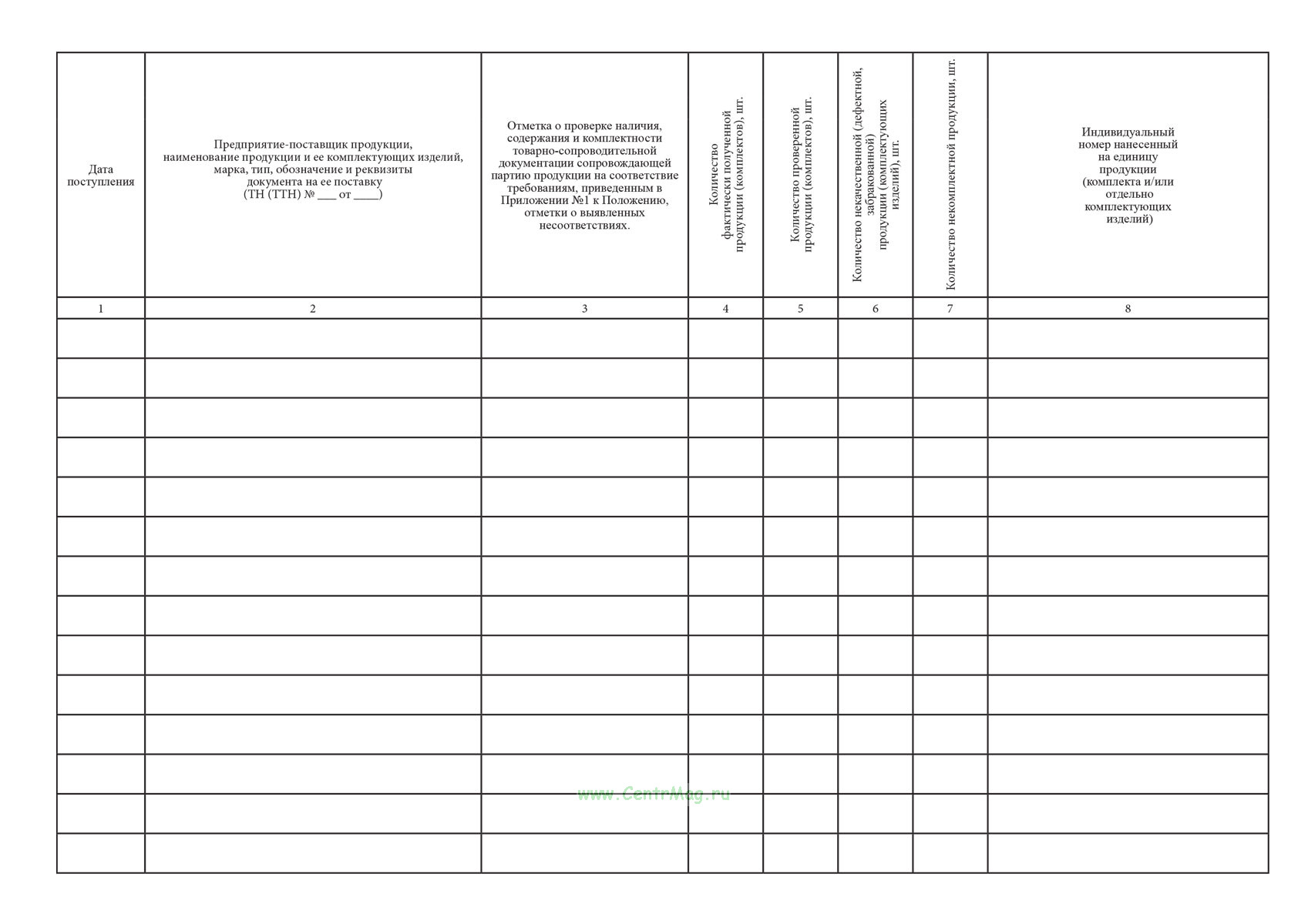 Журнал применяется для фиксации результатов входного контроля продукции при ее осмотре, документального подтверждения проведения проверки качества и комплектности поставки, выявления дефектов и несоответствий, а также принятия решения о допуске продукции к использованию либо об отказе в приемке.