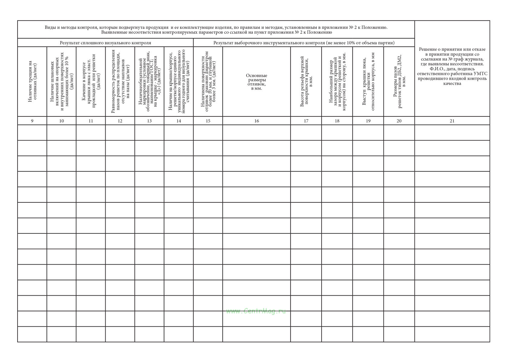 21. Решение о принятии или отказе в принятии продукции со ссылками на № граф журнала, где выявлены несоответствия. Ф.И.О., дата, подпись ответственного работника УМТС проводившего входной контроль качества