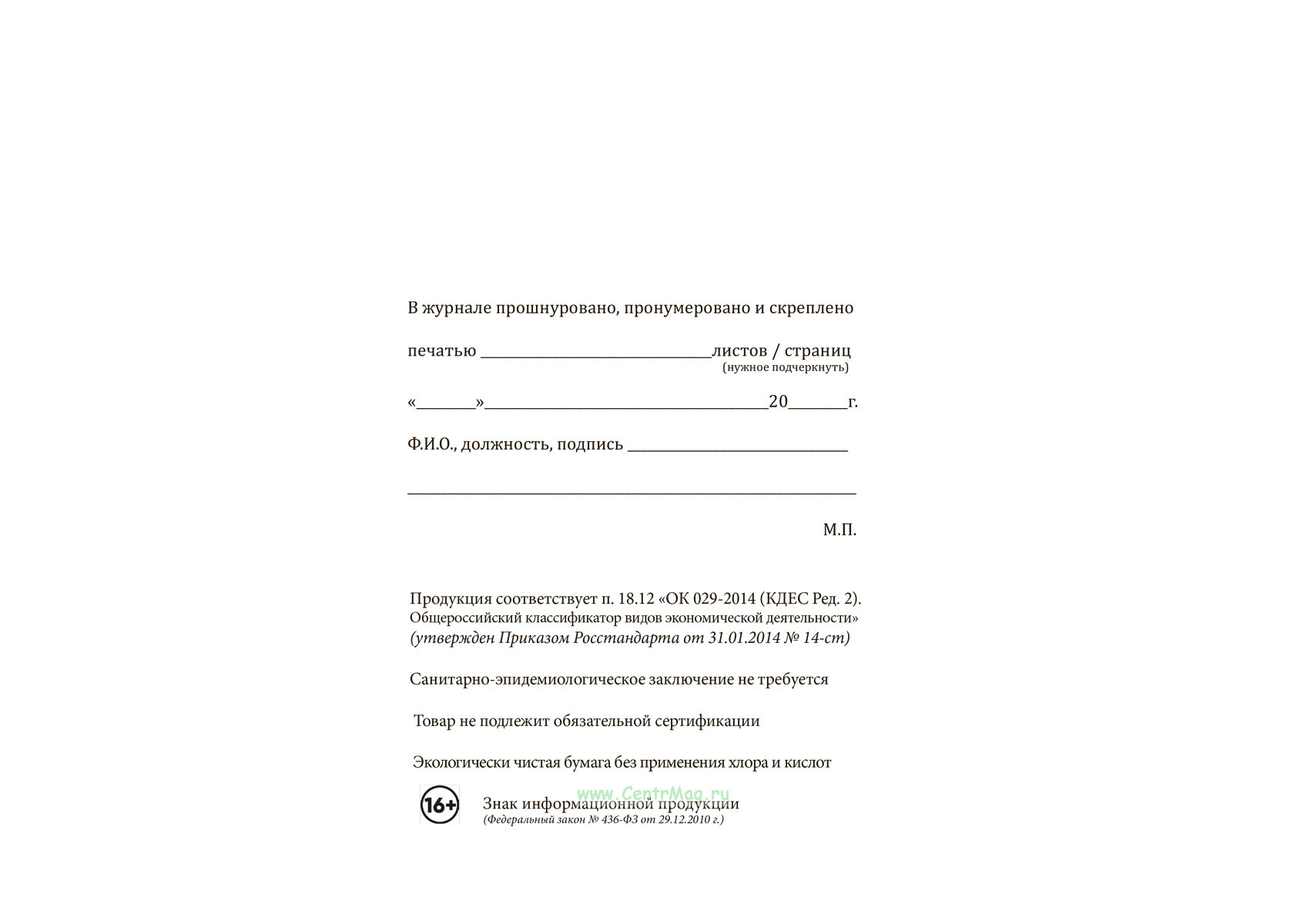 Вы получаете печатную продукцию прошнурованной и c местом для вашей печати в соответствии с действующими нормативными документами: