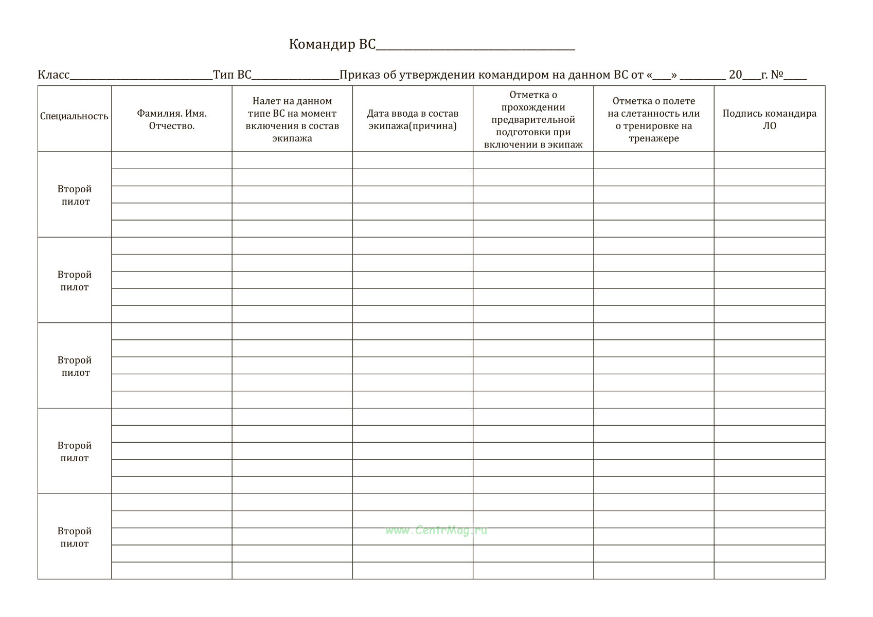 Журнал применяется для учета состава экипажей воздушных судов, фиксации включения членов экипажа, их налета на данном типе ВС, прохождения подготовки и тренировок, а также для контроля соответствия установленным требованиям к летному составу.