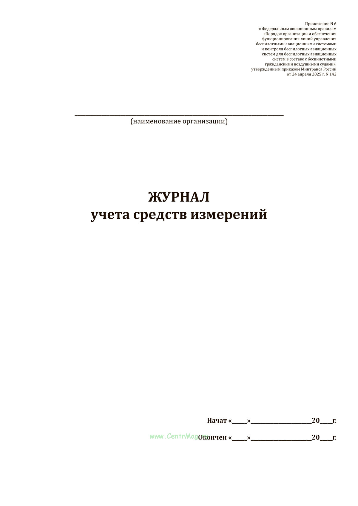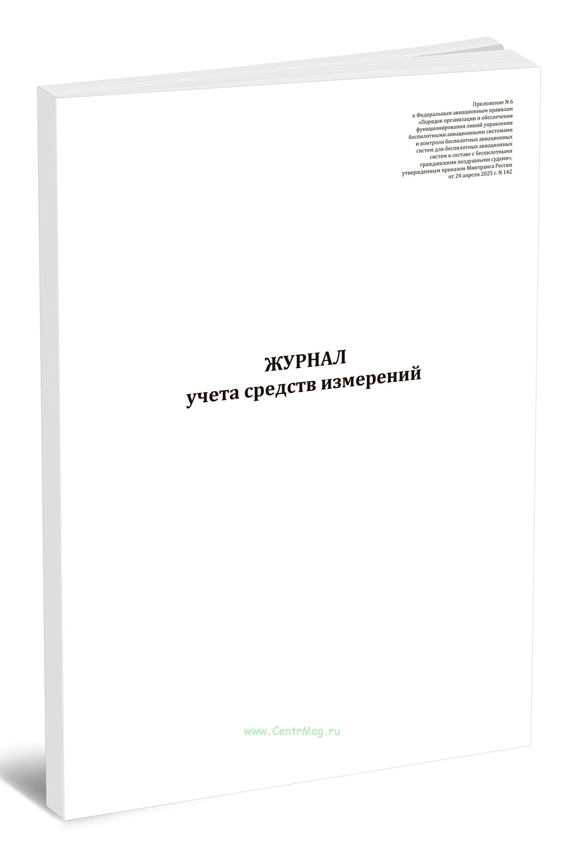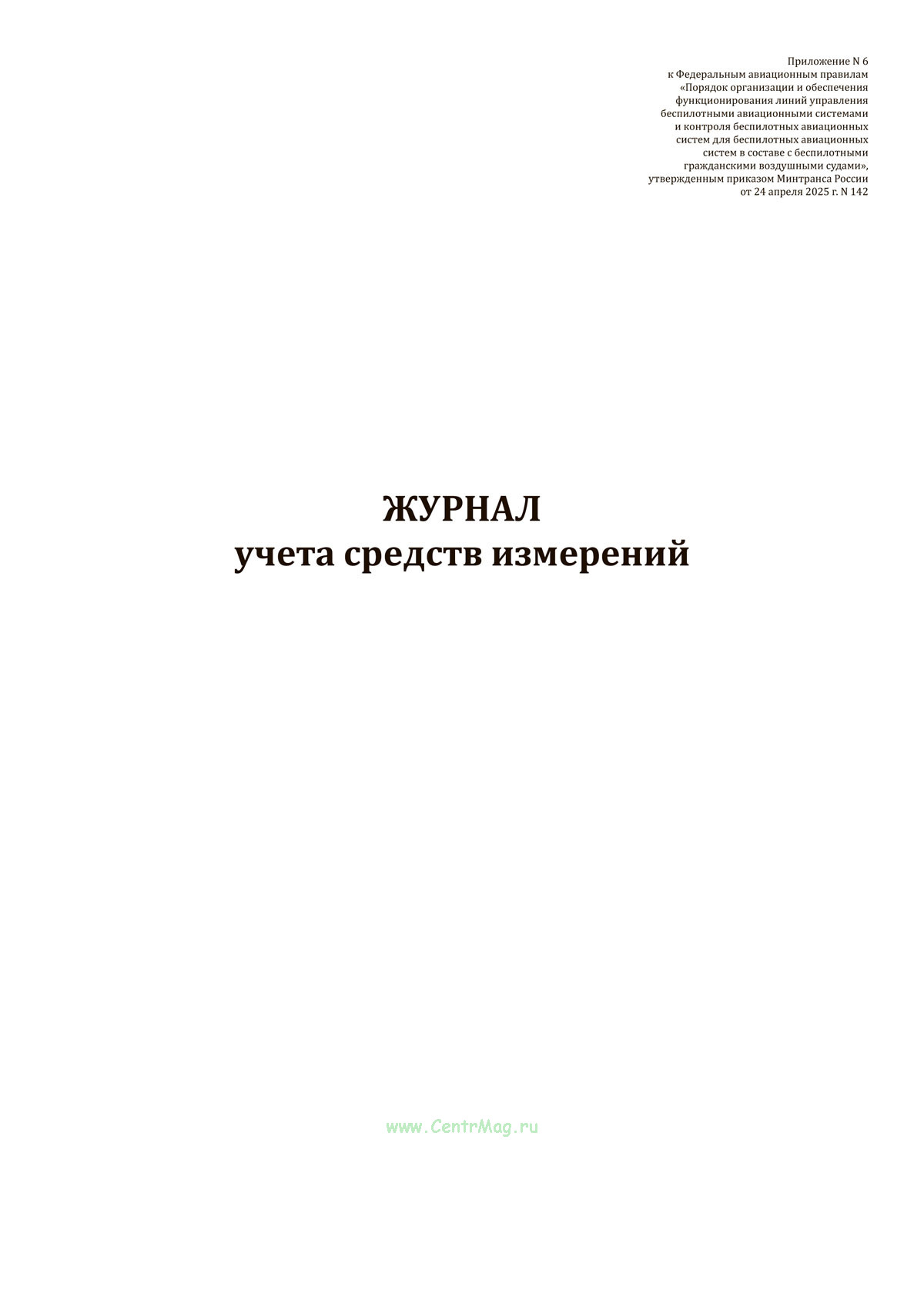 Форма журнала учета средств измерений соответствует Приложению N 6 к Приказу Минтранса России от 24.04.2025 N 142 "Об утверждении Федеральных авиационных правил "Порядок организации и обеспечения функционирования линий управления беспилотными авиационными системами и контроля беспилотных авиационных систем для беспилотных авиационных систем в составе с беспилотными гражданскими воздушными судами"