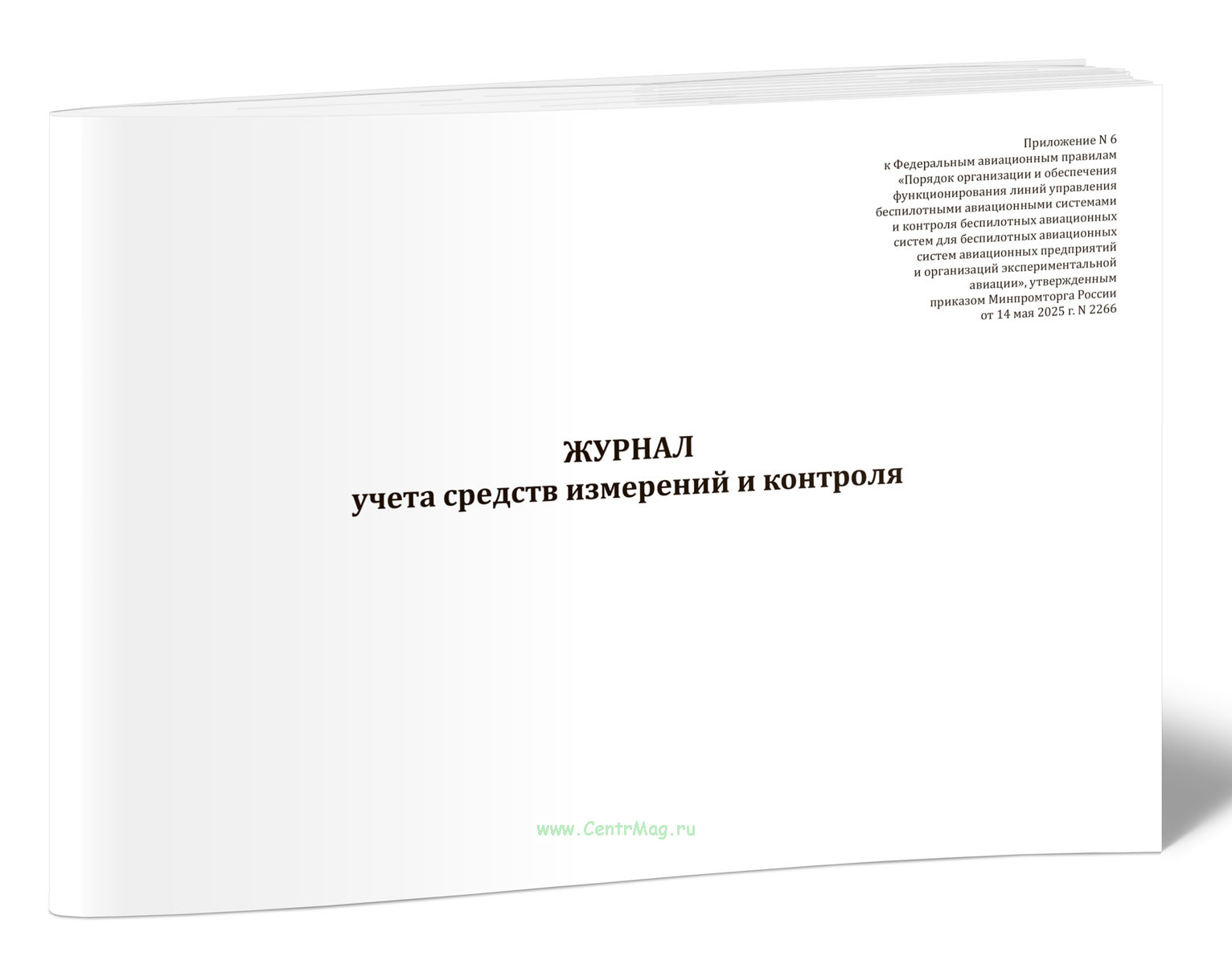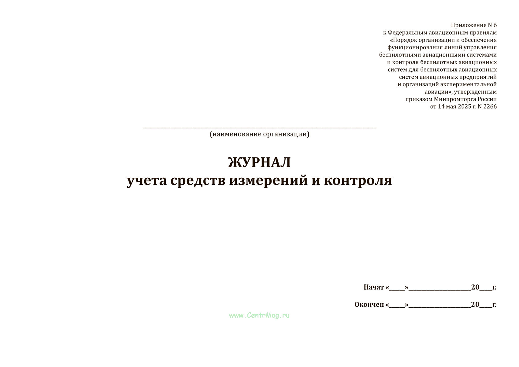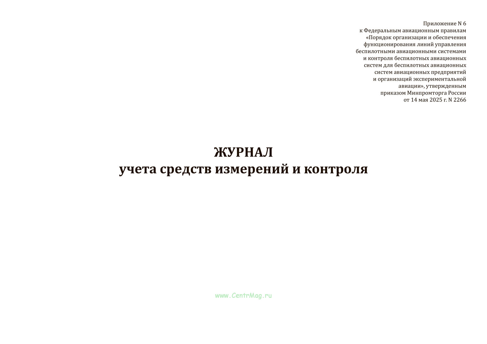 Форма Журнала учета средств измерений и контроля соответствует Приложению N 2 к Приказу Минпромторга России от 14.05.2025 N 2266 "Об утверждении Федеральных авиационных правил "Порядок организации и обеспечения функционирования линий управления беспилотными авиационными системами и контроля беспилотных авиационных систем для беспилотных авиационных систем авиационных предприятий и организаций экспериментальной авиации"