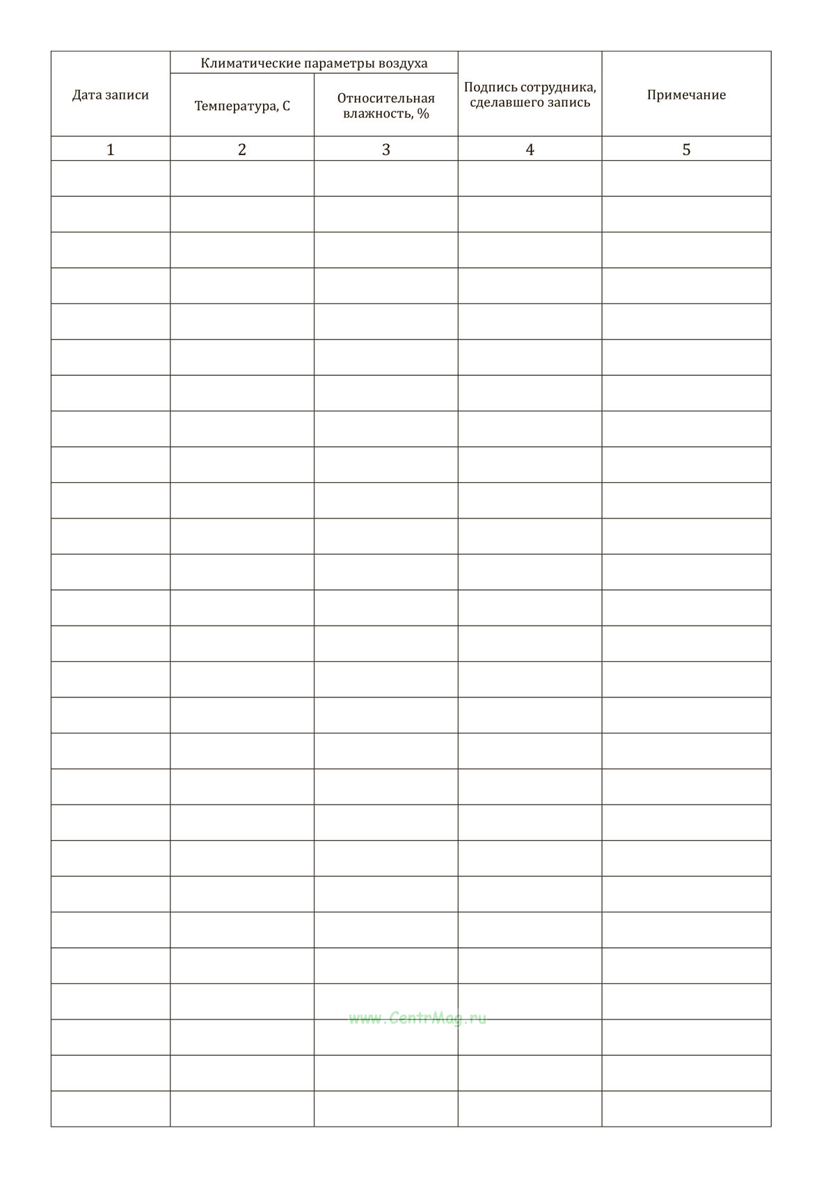 Журнал применяется для регистрации и контроля климатических параметров воздуха (температуры и относительной влажности) в помещениях с особыми условиями хранения, с целью обеспечения сохранности продукции и соблюдения установленных нормативных требований.