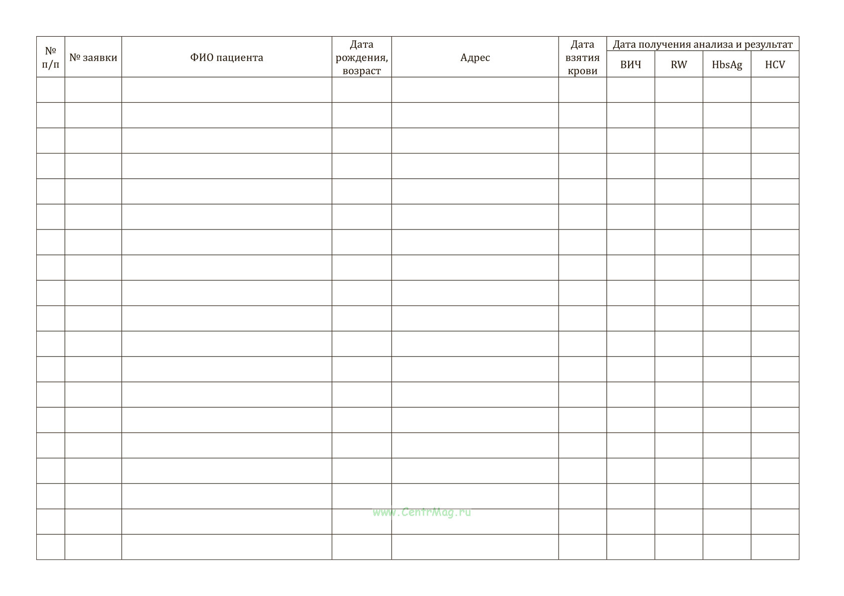 Журнал учета взятия крови на гепатиты, СПИД, RW имеет графы:
