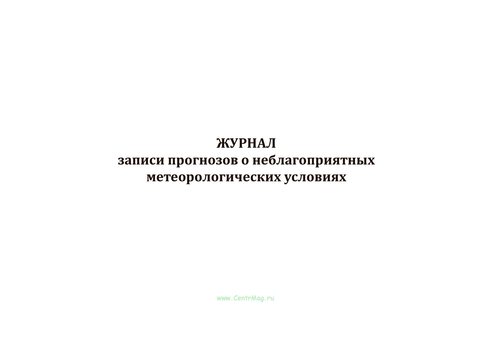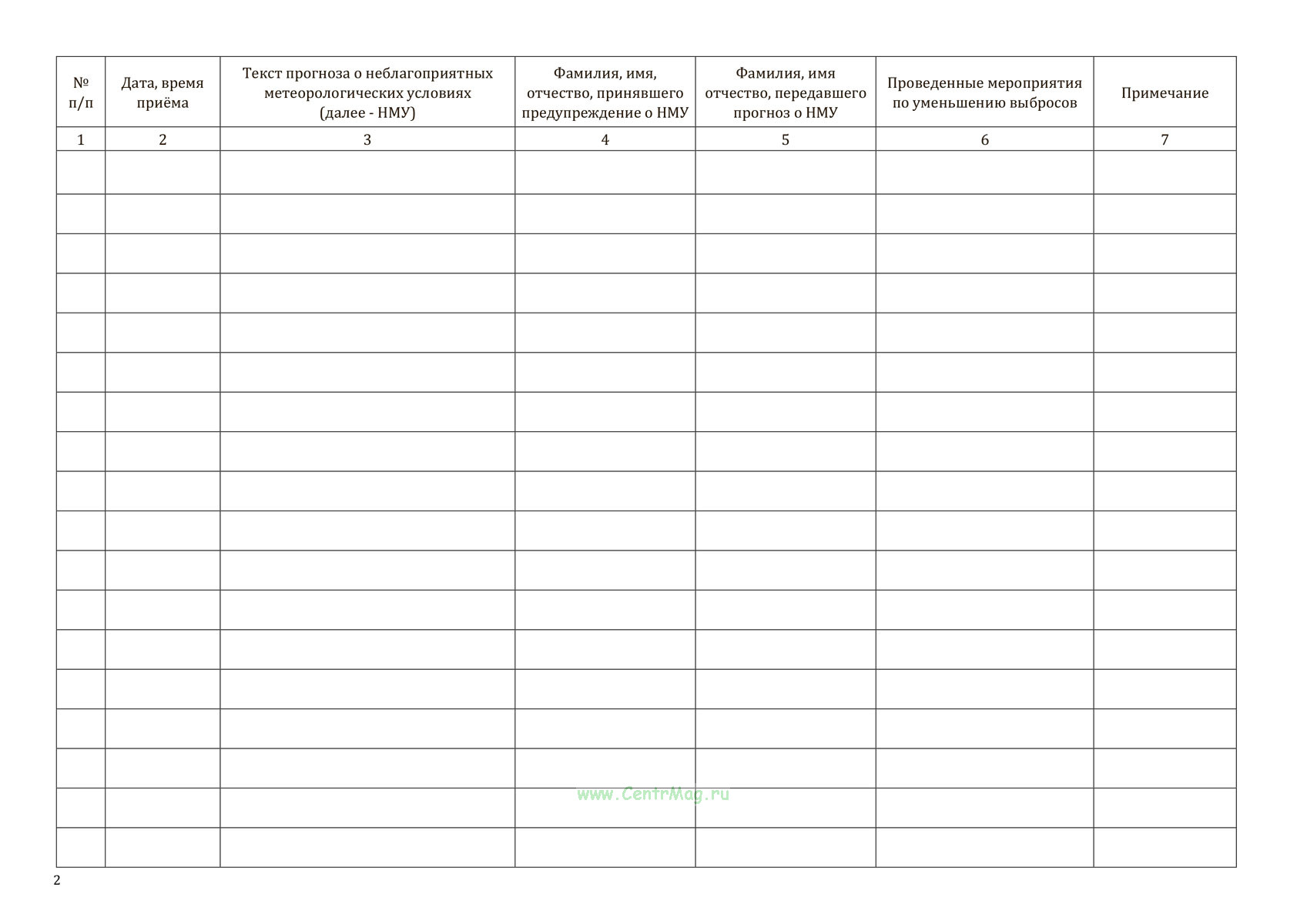 Журнал записи прогнозов о неблагоприятных метеорологических условиях применяется для фиксации получения прогнозов НМУ и последующих действий предприятия. Он используется для документирования предупреждений о метеоусловиях, способствующих накоплению загрязняющих веществ в атмосфере, а также для отражения мер, направленных на снижение выбросов.