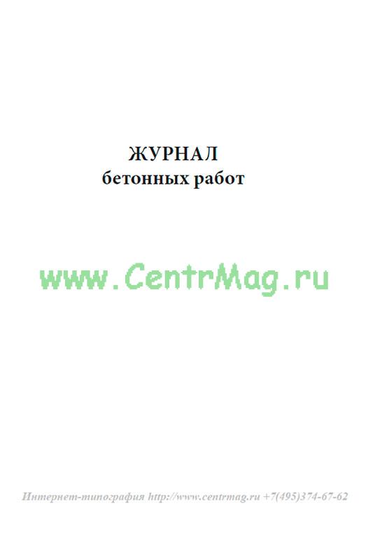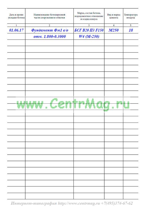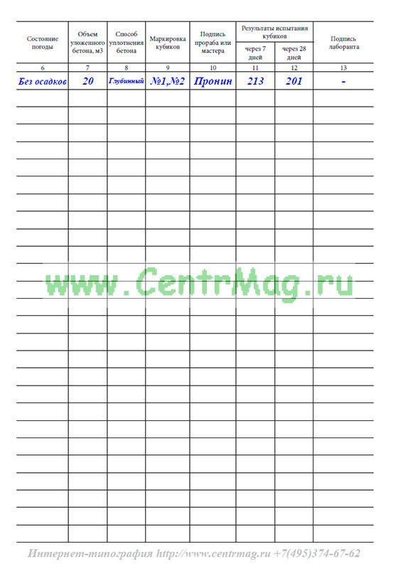 Журнал бетонных работ (13 граф) ведется для каждого объекта строительства. Здесь должно быть зафиксировано наименование бетонируемой части сооружения и конструктивных элементов, марка бетона и № накладной, по которой бетон поступил с завода-изготовителя, результаты испытаний контрольных образцов и другие сведения.