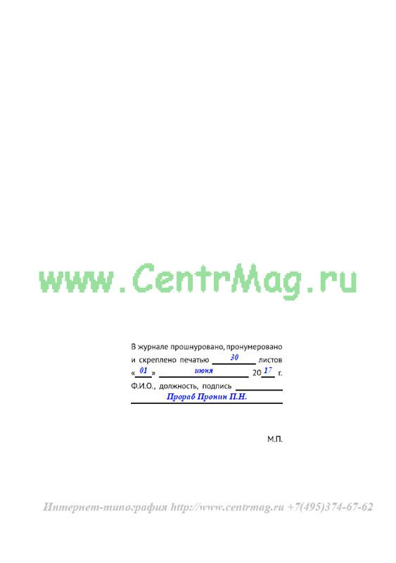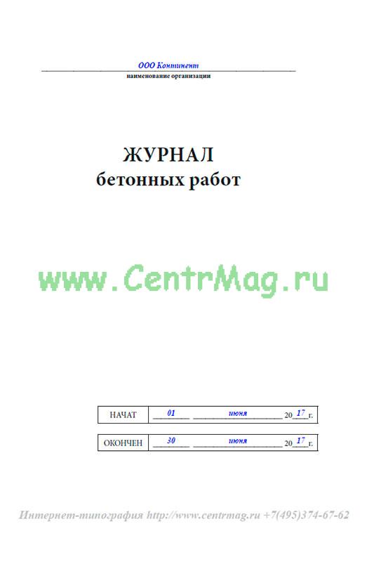 Журнал бетонных работ выдается производственно-техническим отделом генеральной подрядной строительной организации, где заполняется титульный лист журнала, он должен быть прошнурован, пронумерован и скреплен печатью и подписью руководителя выдавшей его организации.