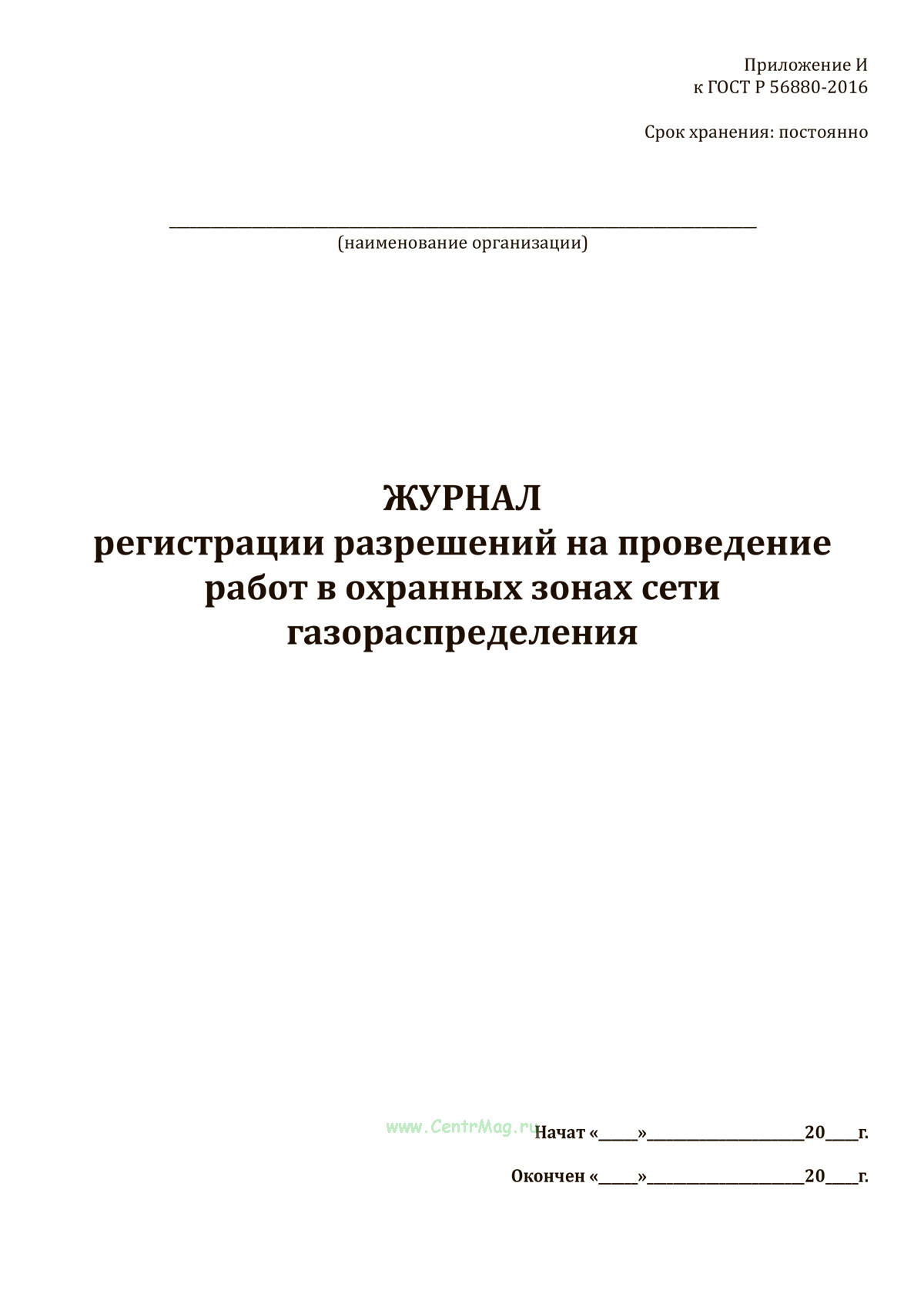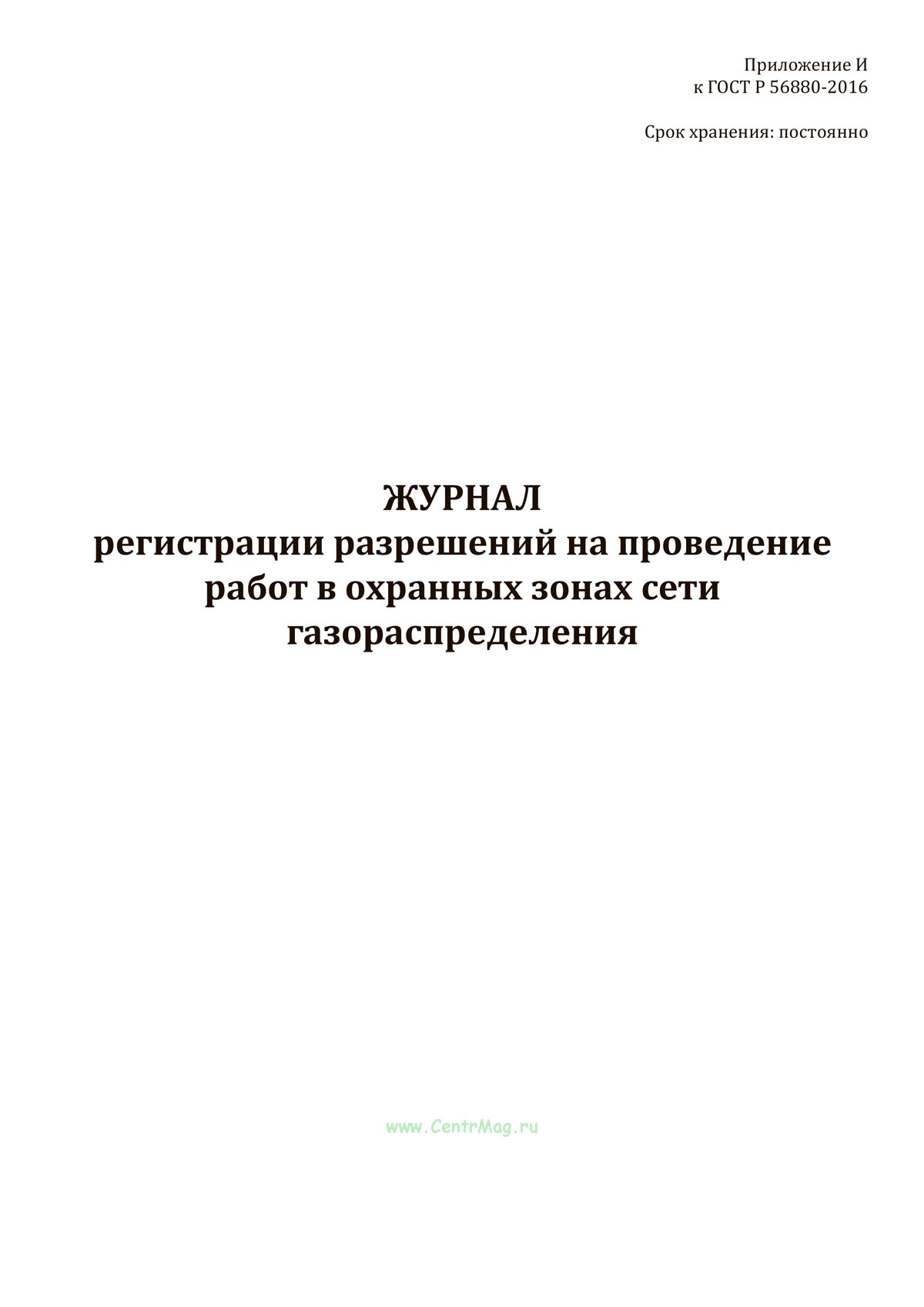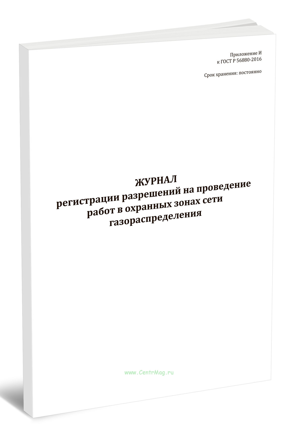 Форма журнала регистрации разрешений на проведение работ в охранных зонах сети газораспределения соответствует Приложению И к ГОСТ Р 56880-2016 Системы газораспределительные. Сети газораспределения. Порядок организации и проведения работ в охранных зонах сети газораспределения. Формы документов.