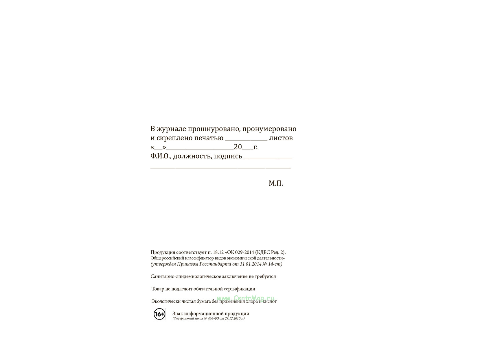 Вы получаете печатную продукцию прошнурованной и c местом для вашей печати в соответствии с действующими нормативными документами: