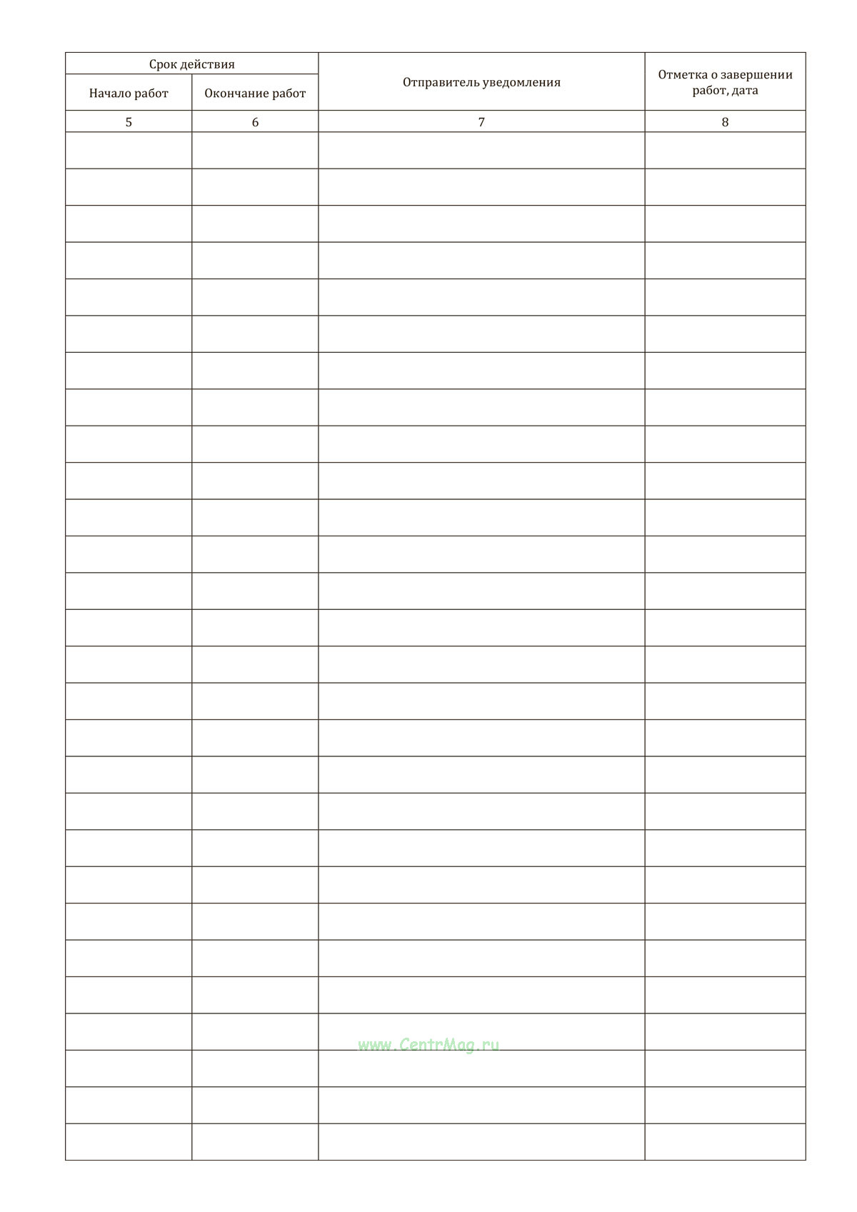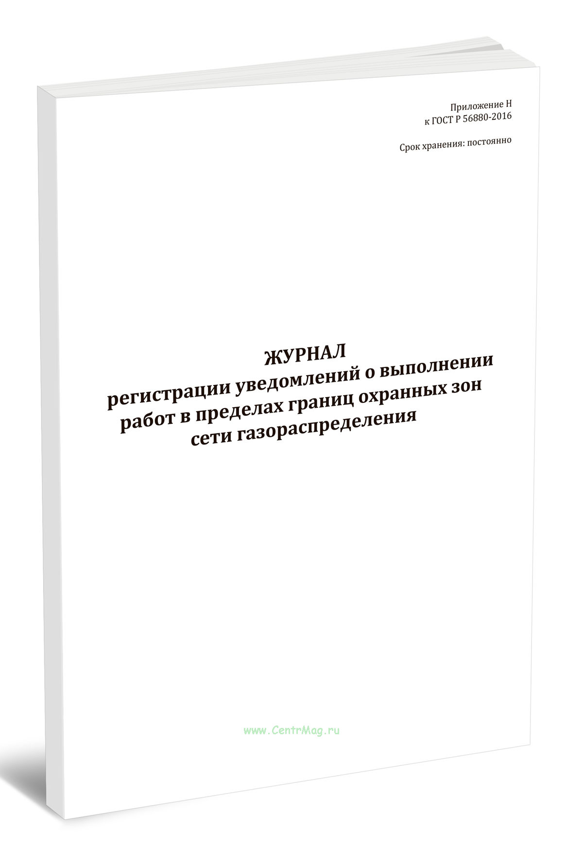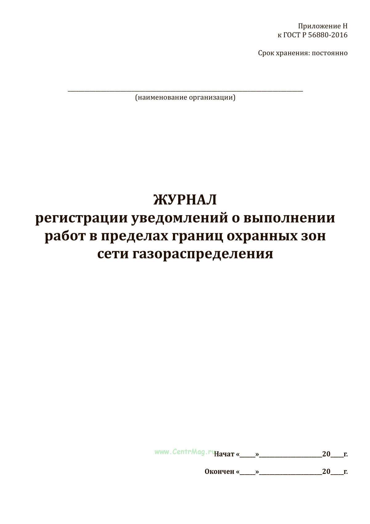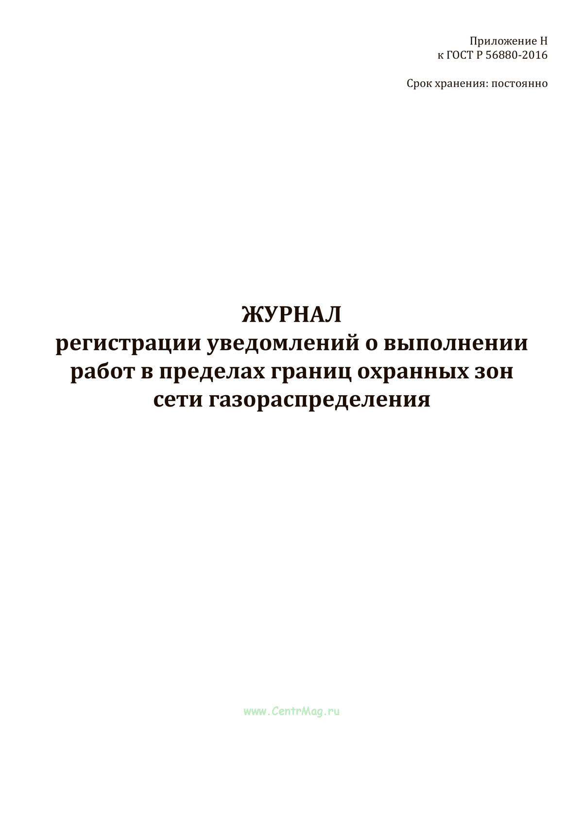 Форма журнала регистрации уведомлений о выполнении работ в пределах границ охранных зон сети газораспределения соответствует Приложению Н к ГОСТ Р 56880-2016 Системы газораспределительные. Сети газораспределения. Порядок организации и проведения работ в охранных зонах сети газораспределения. Формы документов.