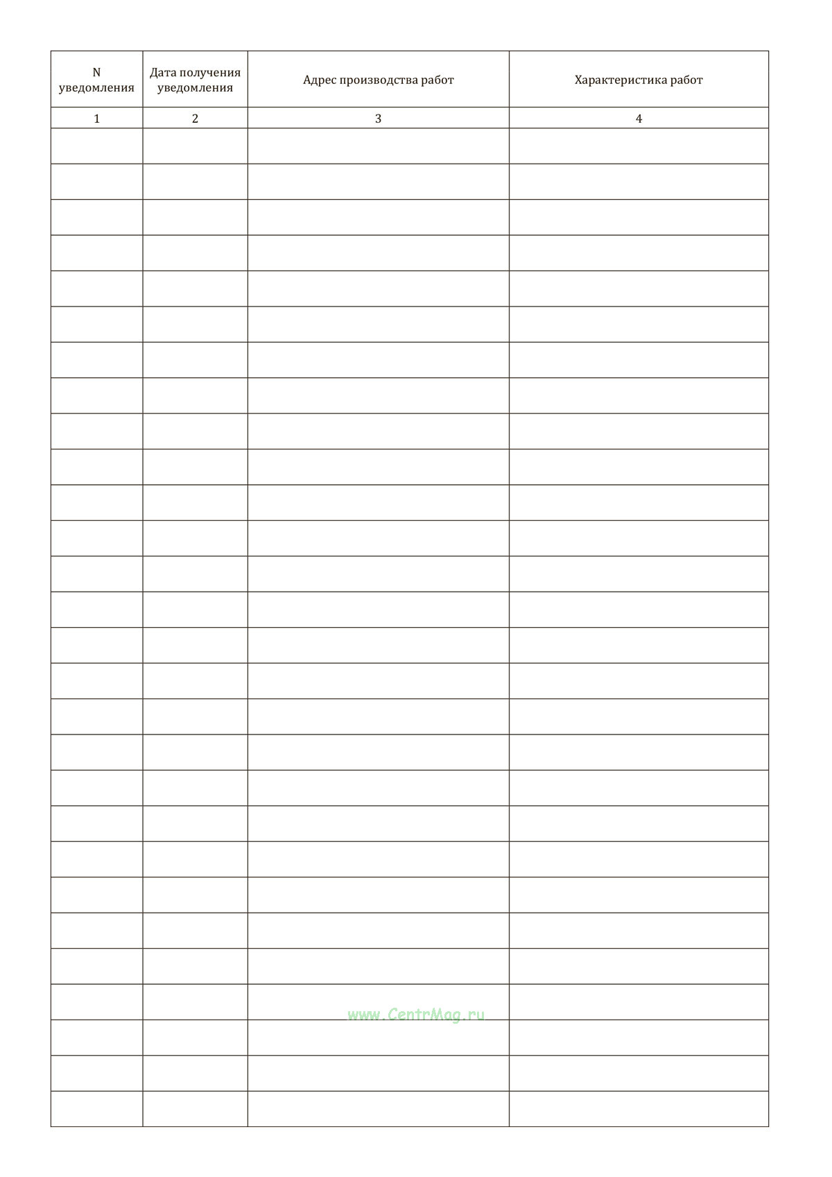Графы журнала регистрации уведомлений о выполнении работ в пределах границ охранных зон сети газораспределения: